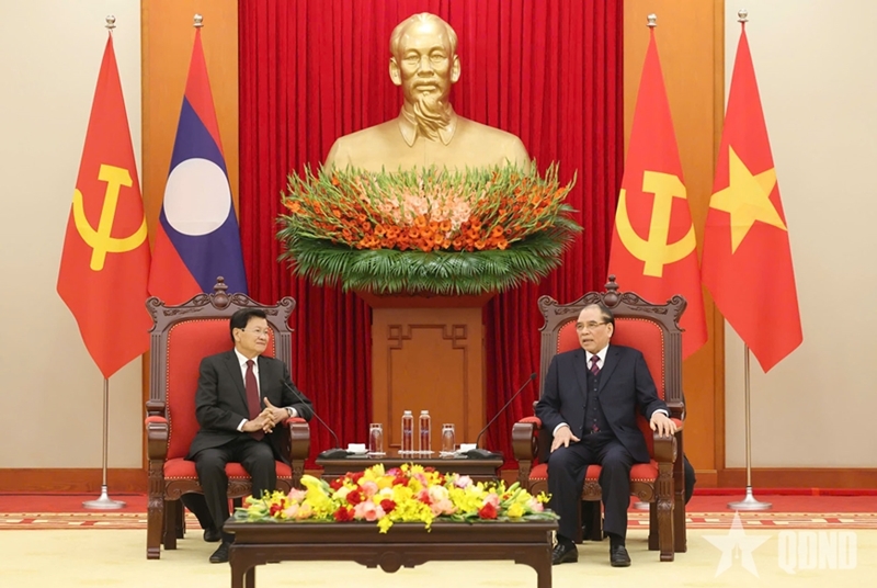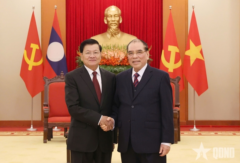 原越共中央总书记农德孟会见老挝人民革命党中央总书记、国家主席通伦(图片来源:人民军队报) |