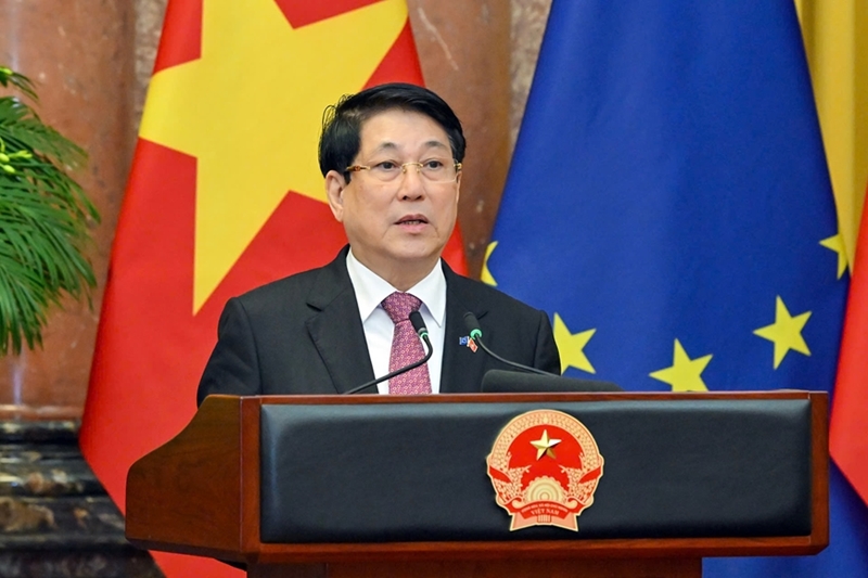 越南国家主席梁强与欧洲理事会主席安东尼奥·科斯塔共同会见记者