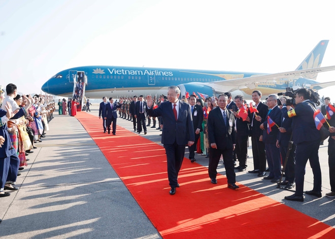 苏林总书记抵达万象,开始对老挝进行国事访问(图片来源:越通社) |