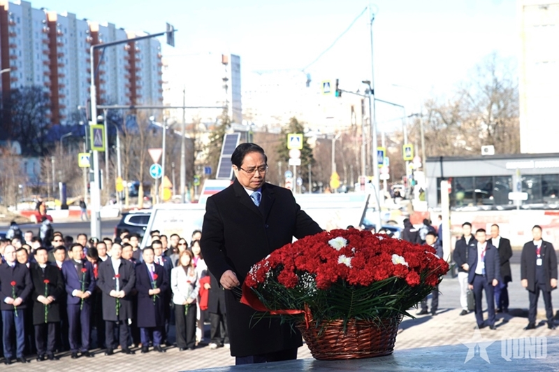 在胡志明主席纪念碑前,范明政总理一行肃立默哀,深切缅怀胡志明——这位伟大的领袖、民族英雄、世界文化名人,以及越南与前苏联(今俄罗斯)人民友好关系的奠基者;并表示将始终珍视并发扬对俄罗斯国家和人民的深厚情谊,推动越俄关系不断走深走实、更加稳固高效发展。