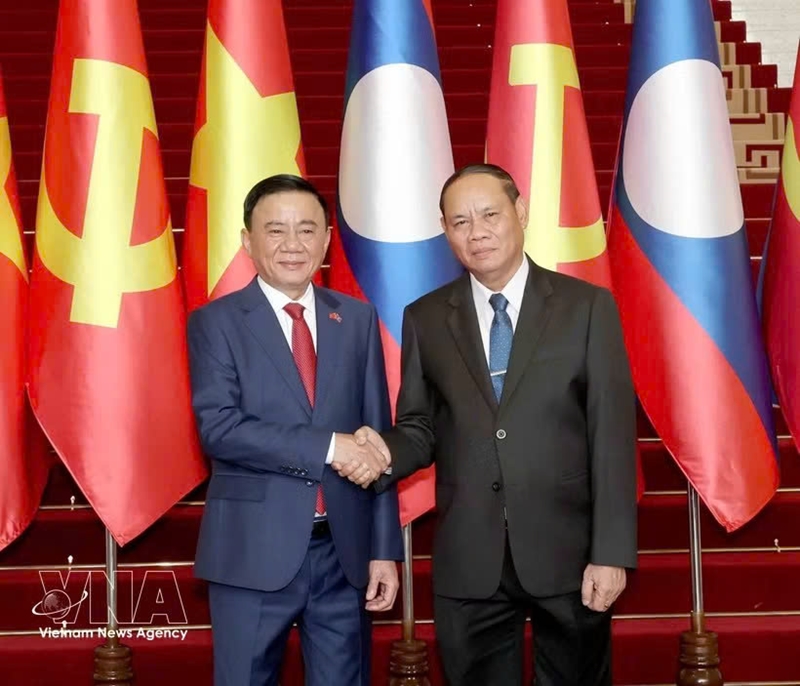 越共中央政治局委员、中央书记处常务书记陈锦秀与老挝人民革命党中央政治局委员、中央书记处常务书记维莱·拉坎丰(图片来源:越通社) |