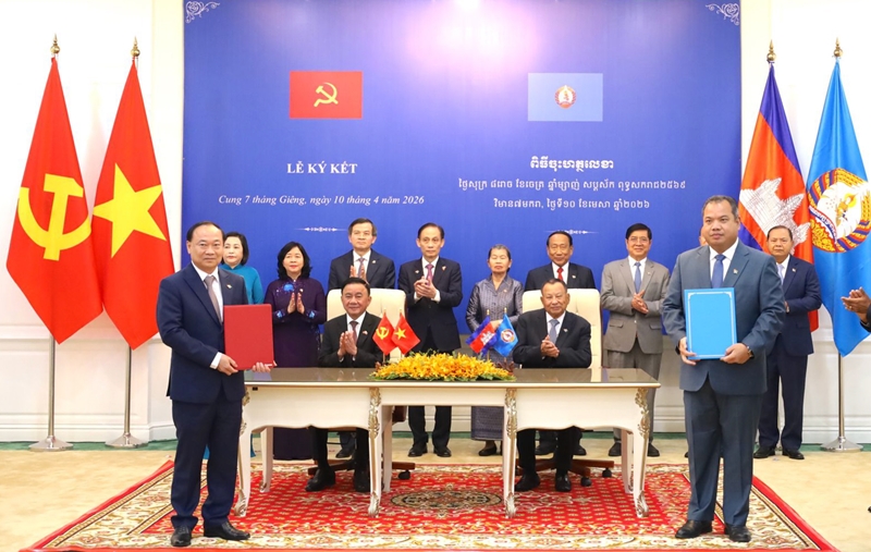 在对柬埔寨王国进行正式访问期间,4月10日中午,越共中央政治局委员、中央书记处常务书记陈锦秀与柬埔寨人民党副主席、中央常务委员会主席赛冲(Say Chhum)共同见证了两国地方间合作文件的交换仪式。