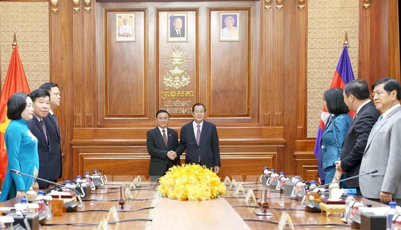 越共中央书记处常务书记陈锦秀会见柬埔寨代理国家元首、人民党主席、参议院主席洪森