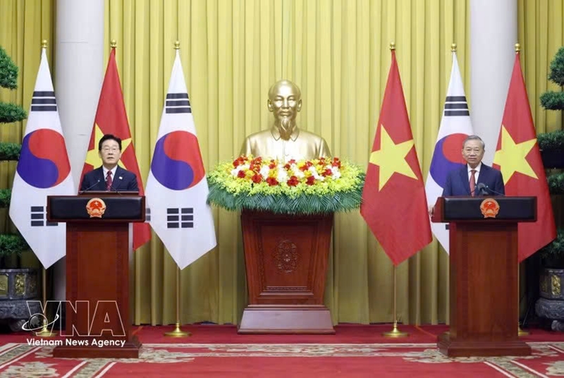 越共中央总书记、国家主席苏林与韩国总统李在明向媒体记者通报会谈结果