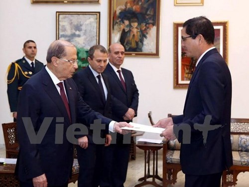 越南驻埃及兼驻黎巴嫩大使杜黄龙4月28日在黎巴嫩首都贝鲁特(Beirut)向黎巴嫩共和国总统米歇尔‧奥恩(Michel Aoun)递交越南国家主席的委任书。