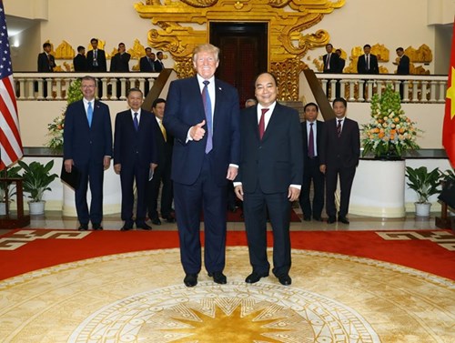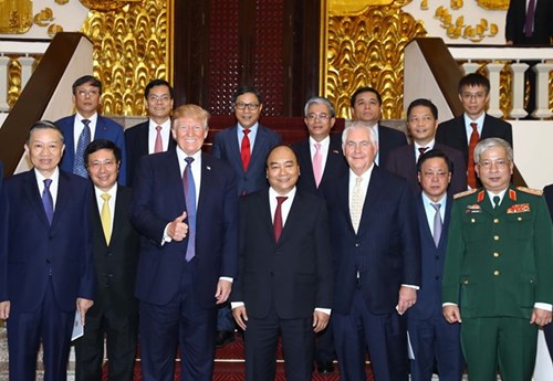 阮春福热烈欢迎特朗普和美国高级代表团对越南进行国事访问,强调越南重视与美国的关系并希望越美关系将不断向纵深发展。阮春福高度评价此访对两国关系的意义和重要性,此访同时还传递美国对亚太地区的政策的相关信息。