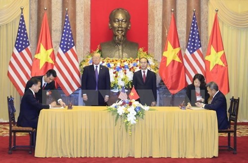 越南国家主席陈大光和美国总统特朗普见证两国合作协议签字仪式(图片来源:越通社)