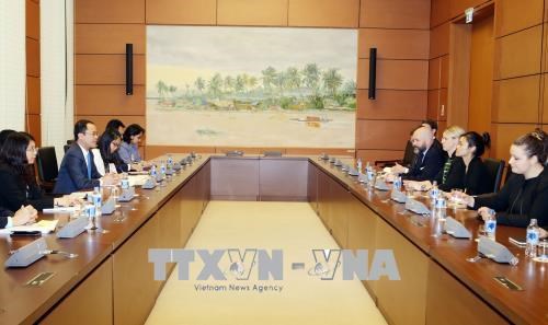 由越共中央常委丁功士率领的国会对外委员会委员代表团3月29日下午会见由美国国会参议员办公室主任娜塔莉·罗杰斯(Natalie Rogers) 率领正在访越的美国国会议员助理代表团。