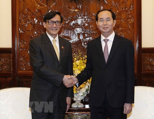 4月4日在主席府,越南国家主席陈大光会见即将离任前来辞行拜会的泰国驻越大使马诺斋•旺帕迪(Manopchai Vongphakdi)。