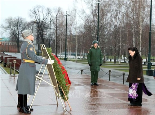 * 当天上午,阮氏金银一行前往设在首都莫斯科的无名烈士纪念碑献上花圈。其后越南国会代表团向设在首都莫斯科红场的列宁陵园敬献花圈并入陵瞻仰列宁的遗容。