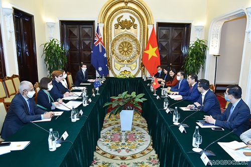 两国外长一致认为,两国总理刚在《联合国应对气候变化框架公约》第26次缔约方大会(COP-26)期间通过的《加强越澳经济合作战略》对实现两国互为十大贸易伙伴之一、双向投资翻番的目标发挥重要作用。澳大利亚将在创新、绿色和可持续增长、高科技农业方面加大对越投资力度,并继续为越南提供官方发展援助。双方同意加强劳务合作,澳方将考虑对越南劳务人员实行“农业签证”政策。双方一致同意加强防务合作和在参加联合国维和行动方面的合作。