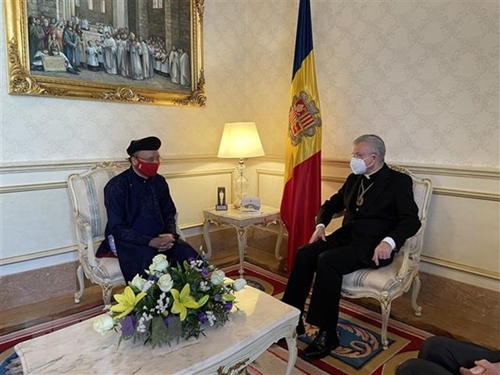 国书递交仪式结束后,安道尔公国主教共同王子约瑟普会见了丁全胜大使。会见中,丁全胜强调,越南希望通过在多边论坛上相互支持、派遣各级代表团互访以及促进在绿色经济、数字化转型、旅游开发等领域上的合作,继续维持和扩大与安道尔的友好合作关系。