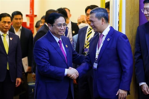 在第40届和第41届东盟峰会及相关会议期间,11月12日,越南政府总理范明政在柬埔寨首都金边会见柬埔寨王家军队副总司令兼陆军司令洪玛内(Hun Manet)大将。