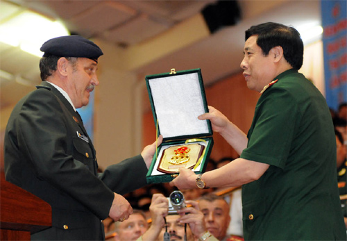 | 冯光青大将向CISM代表授予越南国防部部长标志(图片来源:人民军报) |