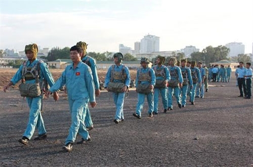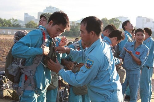 人民军队记者文俊报道:六月份,空军士官学校、海军学院的干部、教练和飞行学员,反恐特战力量在芽庄市进行跳伞训练......