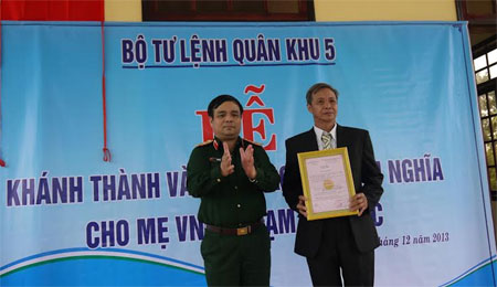 第五军区司令黎瞻中将向越南英雄母亲范氏祝亲属阮文珠先生移交温情屋证书。黎瞻中将表示希望,此栋温情屋将成为历代官兵、青年及学生的革命传统教育基地。