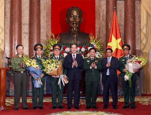 人民军队:9月1日,在主席府,国家主席陈大光向晋升上将、中将军衔的越南人民军三位高级军官颁发命令状。