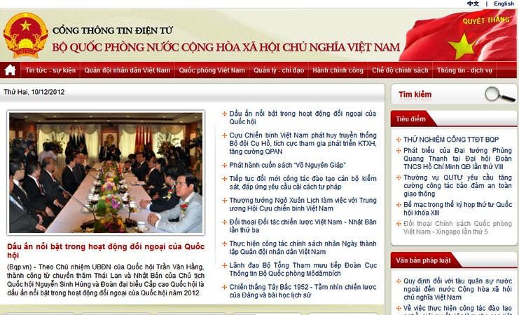 人民军报记者亭春报道:越南国防部门户网站于2012年12月12日正式亮相,其网址为 http://www.bqp.vn 和 http://www.mod.gov.vn。这是越共中央军委、越南国防部信息发布的官方网站,为国内外读者提供关于越南国防部活动的正确、可靠的信息。