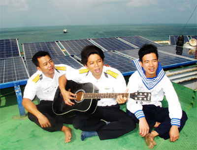 在喜迎2013癸巳年春节来临之际,我们有幸跟随访长沙群岛DK1/10海上高脚屋的“大家庭”之旅。这充满温馨的旅程带着陆地人民对驻岛战士真诚的关爱。在一片灰蓝色,天海难分的景色中,我们在高脚屋里围坐在一起,海上高脚屋的政委裴春活中校建议:“我们这里DK1/10海上高脚屋的战士缺乏家庭的温暖,因此陆地人的每一句话、每一首歌都是我们无比珍贵的礼物。难得能接待一次嘉宾,为了表示战士们的好客之心,我们海上高脚屋的战士为各位演唱一首DK1/10高脚屋的传统歌首”。政委的意见立即赢得一阵阵热烈的掌声。一把吉他立即被送来,DK1/10高脚屋的干部和战士一起高唱海上高脚屋传统之歌。歌声飞扬、浪漫,表演动作熟练,使在场的人都赞叹不已。“你们自学唱歌还是有导师?”我好奇地提问,职业军人阮伯强少尉笑着说:“没有导师,也没有导演!是我们互相学习而得的!一 有空闲时间或是想家的时候,我们都用歌声来安慰自己,安慰战友。浪漫的歌词,美妙的歌声就成为我们这里最宝贵的精神礼物。唱歌主题无限,只要熟悉歌词就能唱,会唱的人教给不会的,我们一起唱起歌颂亲爱祖国的歌曲,自然而然就养成我们爱唱歌的习惯”。职业军人阮伯强少尉的话让我深深地感受到海岛上战士们的乐观及热爱生活的精神。战士们深沉且甜蜜的歌声给在一望无际的大海中微小的高脚屋带来顽强的精神和伟大的力量,使凶猛的大浪变为微弱无力。