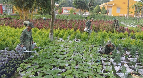 9师1团2营6连战士照顾花卉,用于美化军营面貌(图片来源:人民军队报)