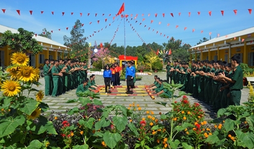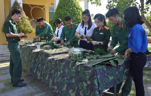 9师2团4营干部、战士和胡志明市古芝县青年团员进行包粽子比赛(图片来源:人民军队报)