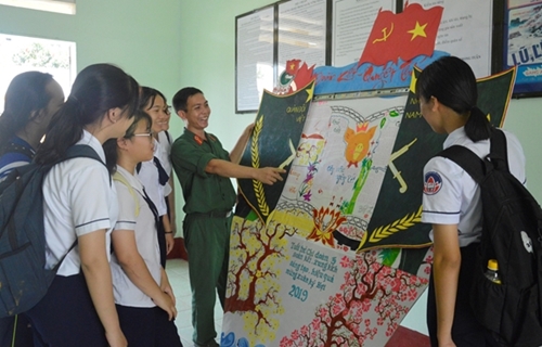 9师2团4营战士向学生们介绍单位的“贺党贺春”墙报(图片来源:人民军队报)