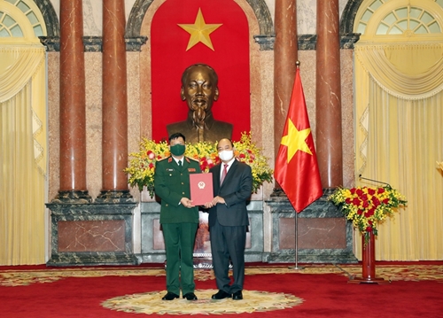国家主席阮春福向陈越科同志颁发晋升上将军衔的命令状(图片来源:人民军队报) |