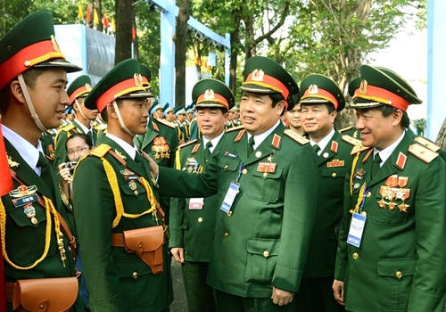 2015年4月28日,冯光青大将亲切慰问参加庆祝越南南方解放、国家统一40周年阅兵式的官兵(图片来源:人民军队报) |