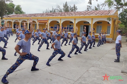 人民军队:海军第四区部队新兵们顶着酷热的天气以高度的决心和自信精神进行训练,同时积极钻研、掌握好训练内容、圆满完成任务。
