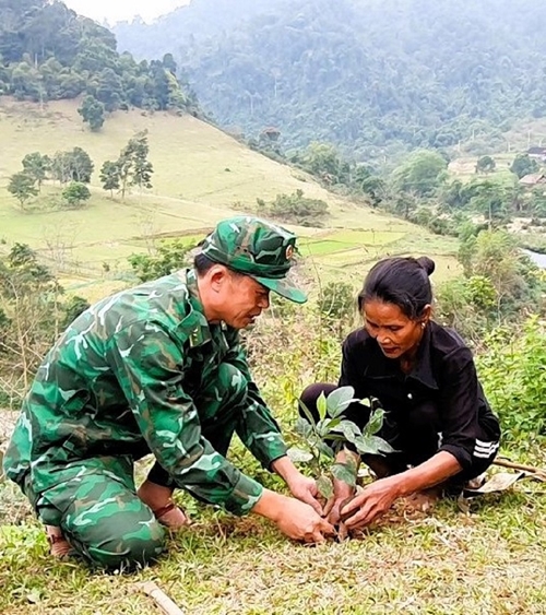 义安省边防部队的妇女与地方女性团员青年一起积极种植和照料树木(图片来源:人民军队报)