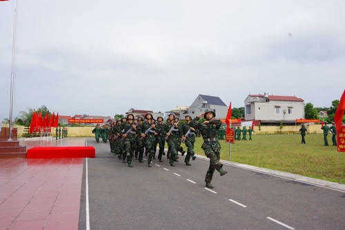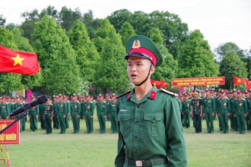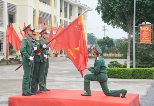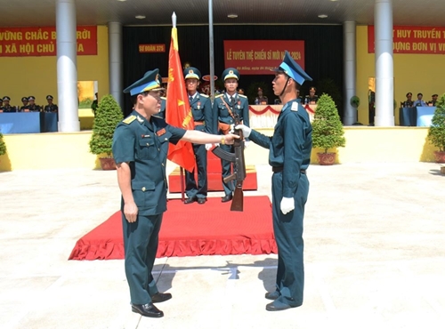 越南人民军总参谋部144旅新兵举行亲吻军旗仪式。