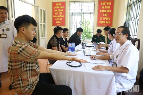 三岛县医疗中心的医生正在检查准备于 2025 年入伍的青年的健康状况(图片来源:人民军队报) |