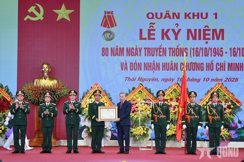 10月16日下午,越南国防部第一军区党委、司令部在太原省隆重举行第一军区武装力量传统日80周年(1945.10.16-2025.10.16)纪念典礼暨胡志明勋章授勋仪式。