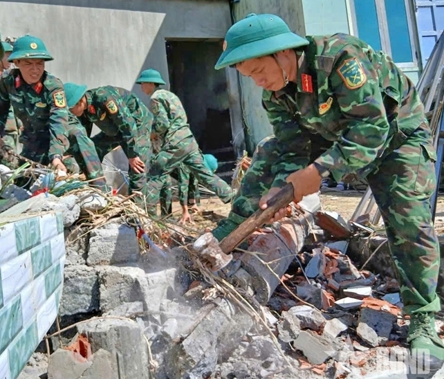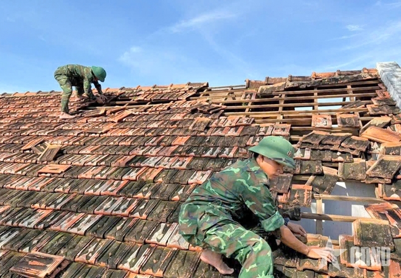 嘉莱省安良乡安美村村民谢明凤先生房子屋顶被完全掀翻,屋内东西一片凌乱。避风回来后,他既疲惫又心痛,不知从何着手。他激动地说,2师官兵来到家中,对他说只要人还在就还有一切;屋顶被掀了,没事,战士们会帮家里重新做好屋顶。民众要坚强、团结,一起渡过难关。于是他和官兵们一起动手清理、修复房屋。