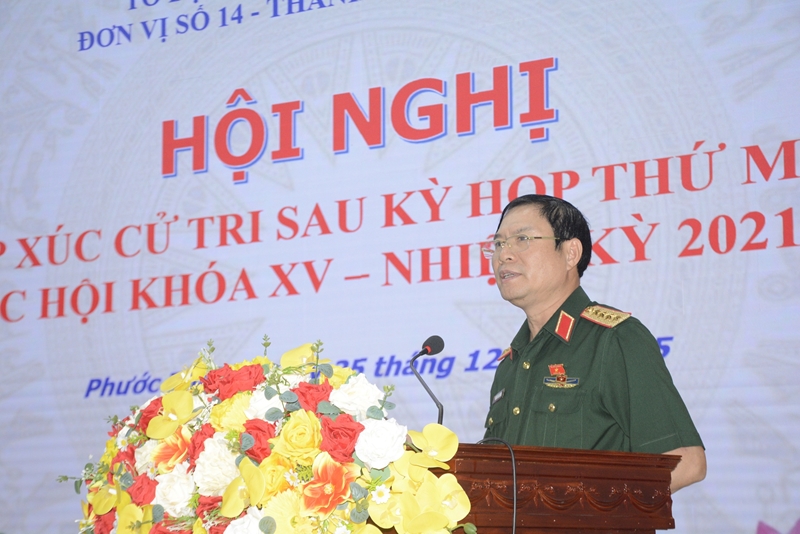 阮新疆大将在发表讲话中向选民通知了第十五届国会第十次会议取得的突出结果,介绍了党和国家正在实施的一系列重大主张和政策,近期在军事、国防任务落实方面取得的一些显著成效。阮新疆大将感谢选民坦率提出的许多切实意见,承诺将选民的建议和意见转达给国会、政府及有关部委,以不断完善政策,确保贴近实际、满足人民的期待。同时,阮新疆大将希望每位公民在解决当前突出问题和不足中继续与地方党委、政府及职能部门同行,主动发现、防范并有效打击各类犯罪行为,为维护安全秩序、推动地方经济社会建设与发展作出贡献。