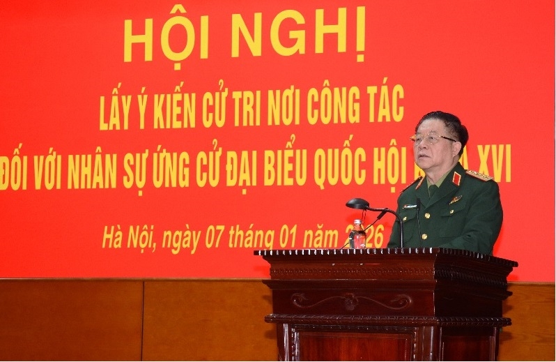 阮仲义大将在征求被提名第十六届国会代表候选人的工作单位的意见的会议上发表讲话(图片来源:人民军队报) |
