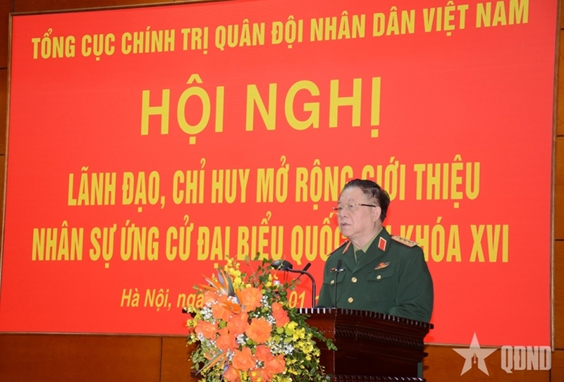 阮仲义大将在推荐第十六届国会代表候选人的总政治局领导人、指挥员的扩大会议上发表讲话(图片来源:人民军队报) |