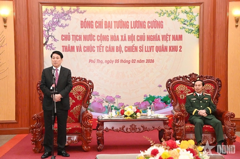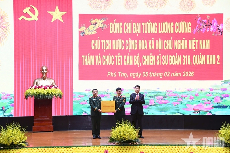 值此机会,国家主席梁强向第二军区武装力量官兵赠送春节礼物。军队电信工业集团(Viettel)和军队股份商业银行向第二军区武装力量官兵捐赠100栋温情屋和数百份慰问品。