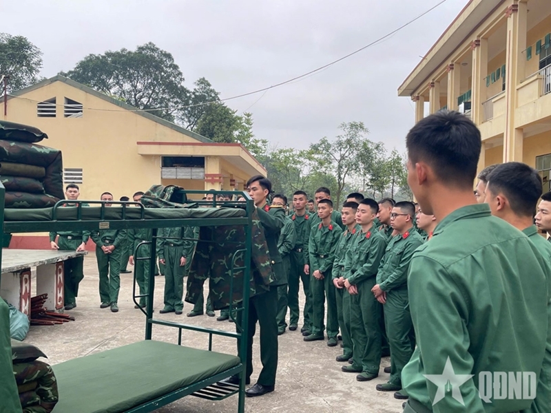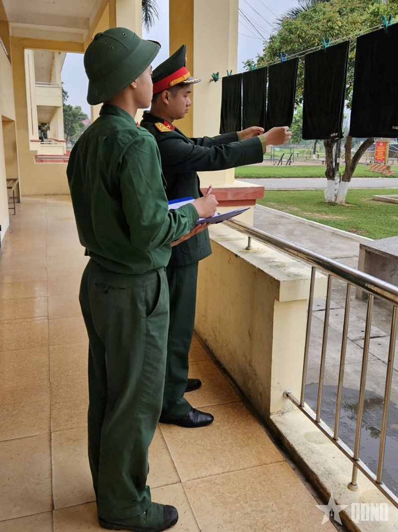 教导部队如何整齐叠放被褥、悬挂衣物(图片来源:人民军队报)