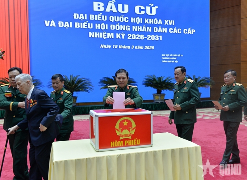 在第十六届国会代表和2026-2031年任期各级人民议会代表选举日的热烈氛围中,军中选民,包括国防部领导和原领导、全军干部、工作人员、学员和战士,认真负责地履行公民的权利和义务。