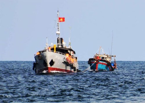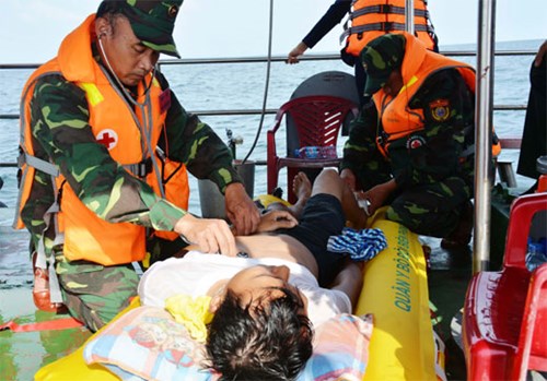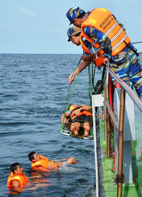 假设情况为:由于受到台风的影响,Q1号渔船在离越门(Cửa Việt)港约1.5海里的海域面临沉船的危险,船上5名船员被落水;Q2号渔船在离越门港约2海里的海域作业时发生主机故障,在海上漂流,船上的3名船员落水。接到急救信号后,广治省边防部队派遣3艘救援船和3个军医小组赶赴现场救援。由于参演力量的周到准备和密切配合,演习已圆满完成各项内容。