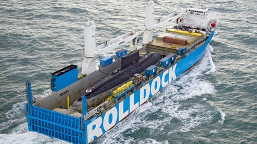 承运越南海军HQ-187“巴地-头顿”号基洛级潜艇的荷兰“Rolldock Storm”号半潜式重吊滚装船(图片来源:越通社)