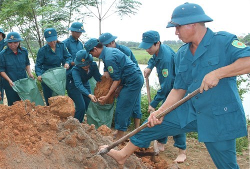 2016年7月,河内市石七县民兵参加防止河水溢出