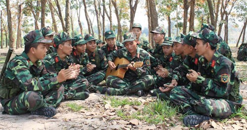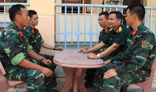 胡志明市司令部嘉定团2营干部在训练一天结束后与战士们互相交流