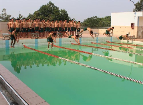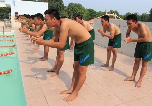 胡志明市司令部嘉定团3营10连新兵进行游泳训练