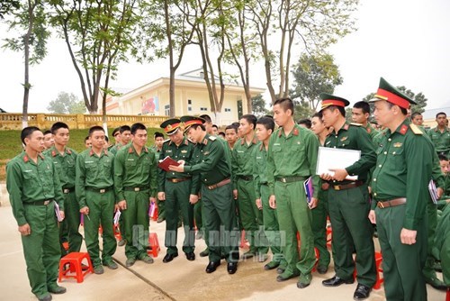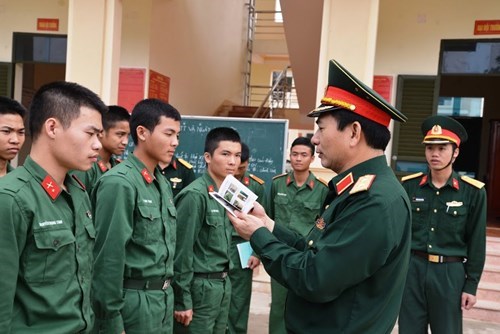 潘文江中将与316师新兵亲切交谈并检查新兵的手册(图片来源:人民军队报)