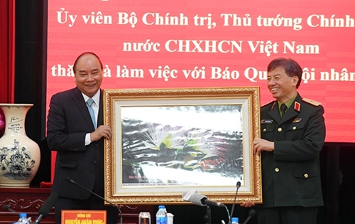 范文训向阮春福汇报《人民军队报》发展历程。《人民军队报》是中央军委和国防部的机关报和越南武装力量和人民的心声。1950年7月,奉行胡志明主席和总司令部的指示,《卫国军》和《游击军》两个报纸已合并成为主力部队和游击军民的共同报纸,并被胡志明主席命名为《人民军队报》,其充分体现了胡志明主席对该军队报纸的信任与爱戴。《人民军队报》于1950年10月20日在太原省定化县定边乡靠姚(Khau Diều)村创刊。从此,10月20日成为《人民军队报》的传统日。