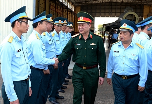 闭春长上将一行参观了A32厂的歼击机维修车间。作为全军负责维修和升级各种歼击机和先进技术装备的唯一单位,多年来,A32厂已出色完成被交付的任务,为全军各单位的训练和战备任务做好保障。在装设备和物资匮乏的条件中,很多飞机使用多年,性能已经退化,A32厂领导、指挥员已鼓励本单位干部、工程师、技术人员发挥内力,促进创新,改进技术。数百个科研项目和模式已验收并投入使用,帮助该厂完成100%生产计划。2018年,该厂的营业额超过3000亿越盾,劳动者的月均收入超过1800万越盾,完成预算指标。尤其是,2018年,A32厂荣获党和国家授予的二级捍卫祖国勋章,连续四年荣获国防部授予的锦旗。