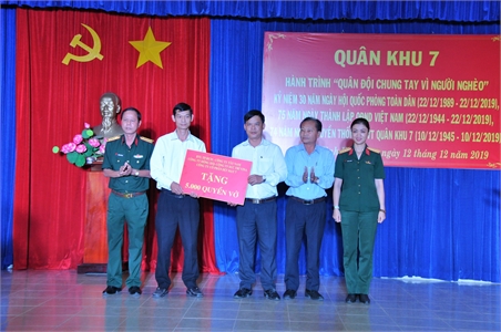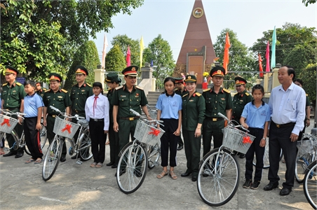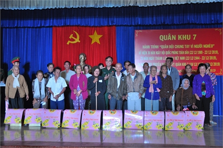 这次活动包括:在第七军区武装力量传统纪念碑前举行敬香仪式,走访慰问越南英雄母亲,文化文艺交流,向50个贫困户赠送礼物,向贫困学生赠送20辆自行车,向平和初中学校和平和南小学学校赠送5000本笔记本,向黎文任先生家庭移交“价值100块越盾房屋”等。此外,第七军区后勤局A军医院为当地人民免费提供医疗药物及赠送礼物。(春秋报道)