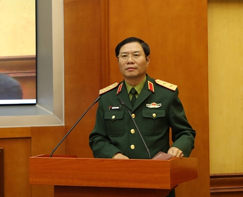 越南人民军副总参谋长阮新疆中将在会议上发表讲话(图片来源:人民军队报) |